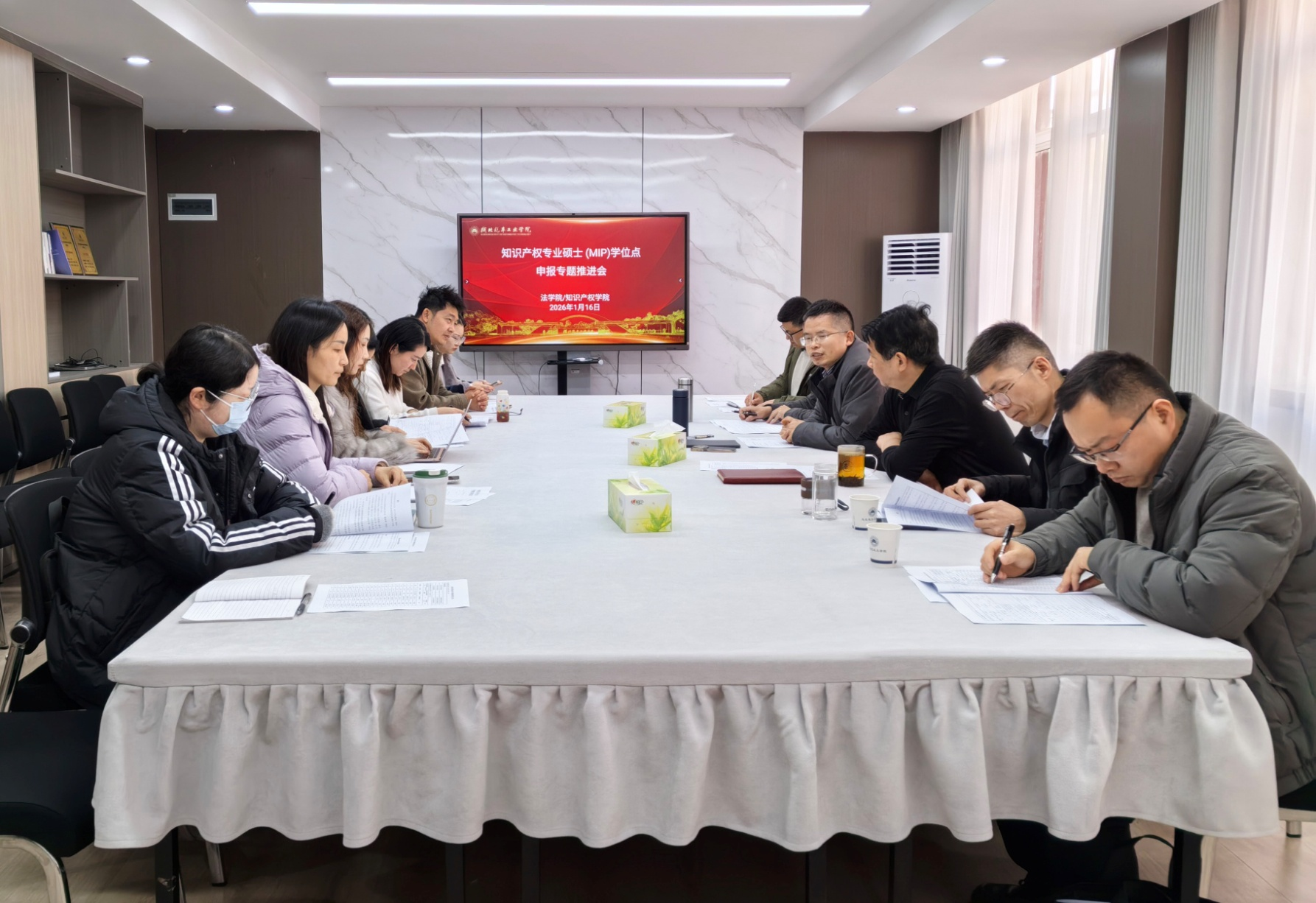 为加快推进知识产权专业硕士学位点申报工作,系统梳理前期进展、协调解决存在问题、明确下一步工作方向,知识产权学院于2026年1月16日下午在学院3206会议室组织召开了知识产权专业硕士学位申报专题推进会。会议由法学与知识产权党委书记计毅波教授主持,知识产权学院院长黄永昌、设计学院副院长朱炜、研究生院学科建设与学位办公室主任何静以及10名申报组核心团队成员参加了会议。